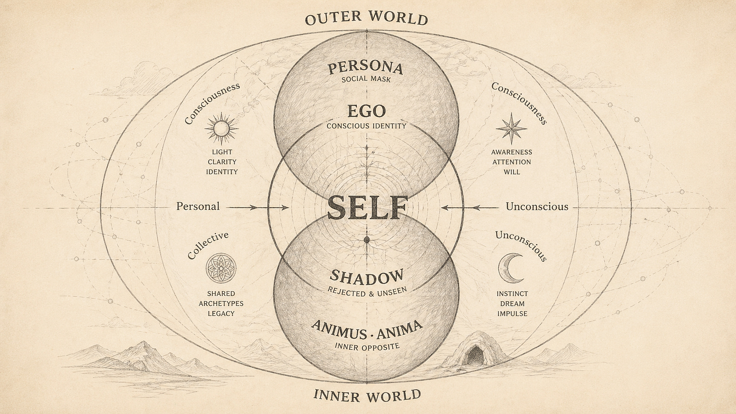 Jung spent decades working out which conditions surface which psychic attractors. He documented how compensation operates when the conscious attitude diverges from the landscape. He catalogued what the signatures of each basin look like in dream, symptom, and symbol.