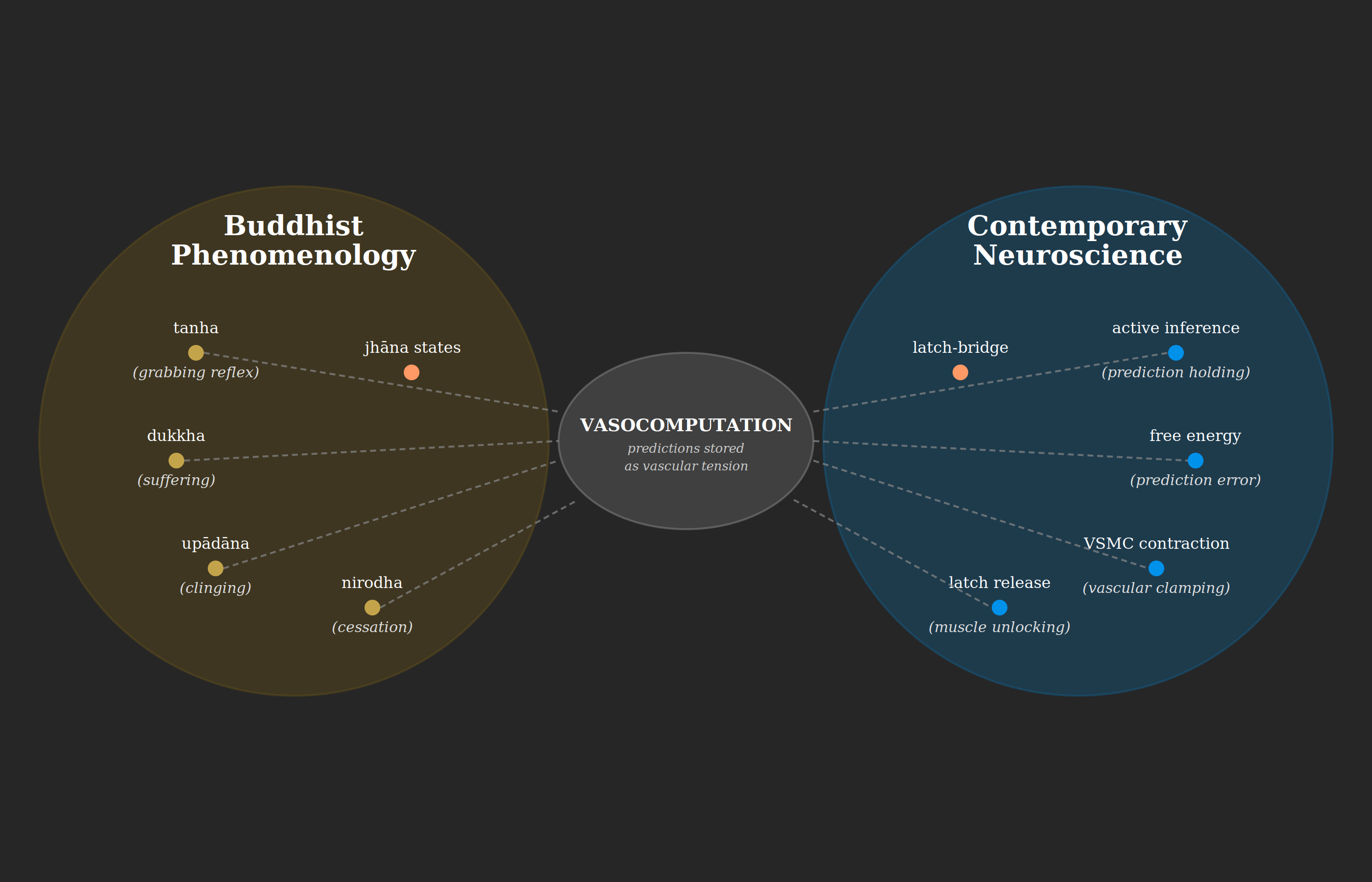 The overlap turned out to be striking. Active inference suggests that the brain impels itself to action by first creating a predicted sensation and then holding it until action makes the prediction true. Johnson noticed that this “holding” maps onto what Buddhists describe as the grabby quality of tanha. And both map onto something physical: vascular smooth muscle cells wrapped around blood vessels throughout the body, which can contract and “clamp” local neural patterns.