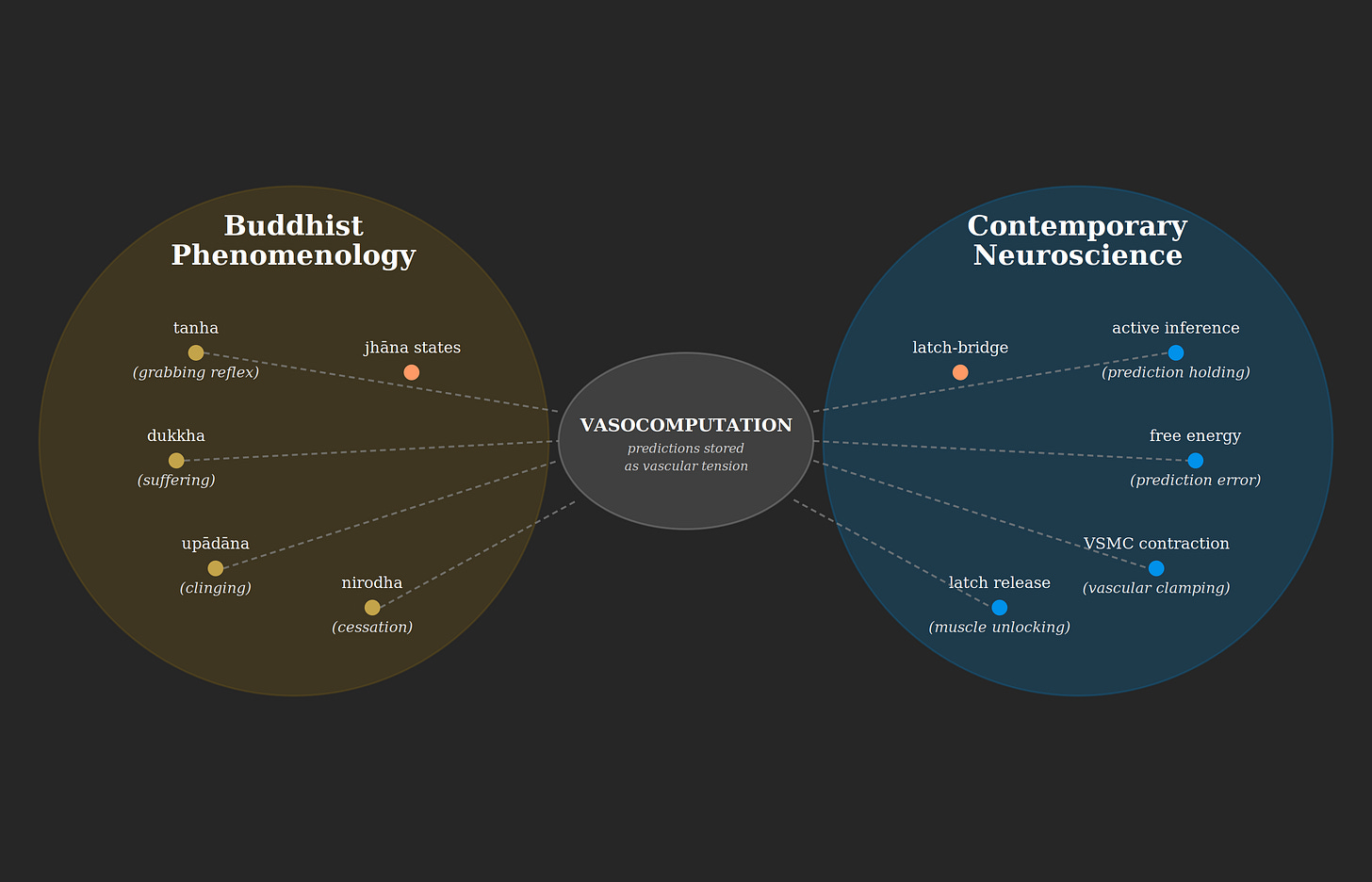 His approach was to take the diagram seriously with Buddhist phenomenology and its careful, millennia-old observations about the structure of suffering on one side and contemporary neuroscience, active inference, and the physiology of vascular smooth muscle cells on the other.